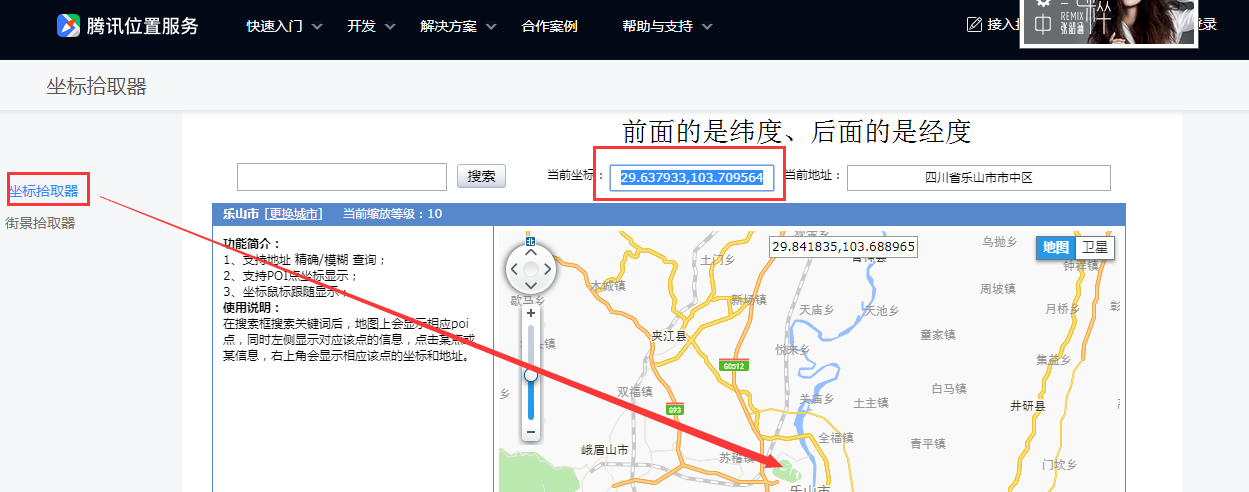 注意:获取坐标时  前面的坐标是纬度、后面的是经度