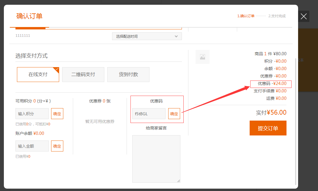 2.在pc端,使用优惠码的界面,输入优惠码后点击确定,即可看到优惠的金额。如图所示: