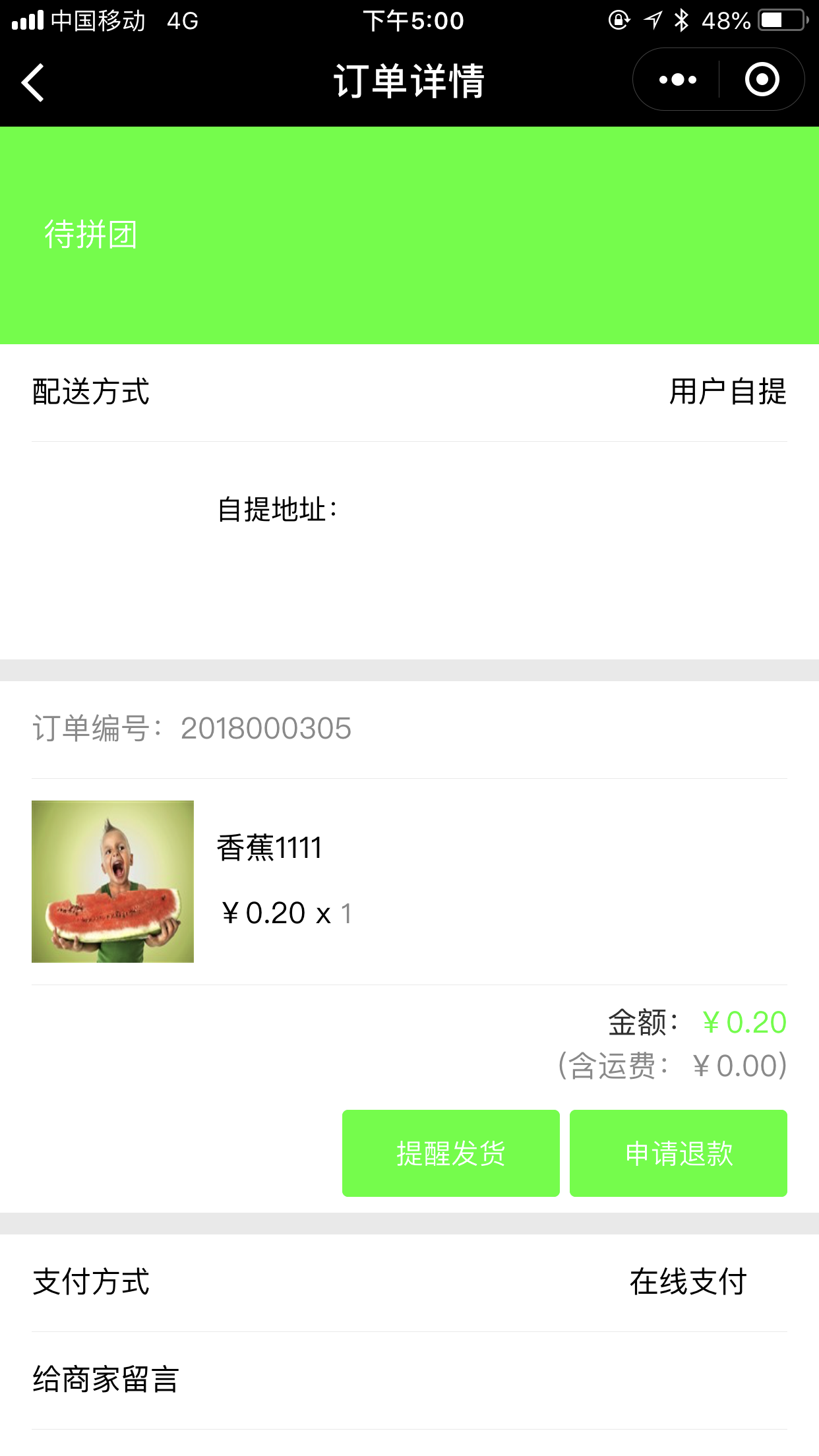 3.用户在前台下单完成之后,可以将带有小程序码的页面截图发送给其他人,或者将小程序发送出去,其他用户可以通过扫描小程序码式或者是分享的小程序进入到页面中,即可拼团,若该团已经拼团成功或拼团失败,也可以从该页面跳转到首页,如图所示: