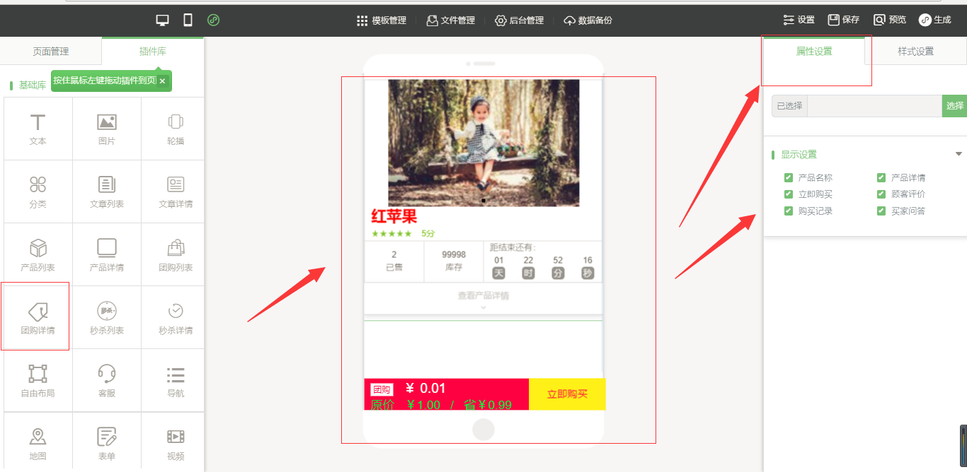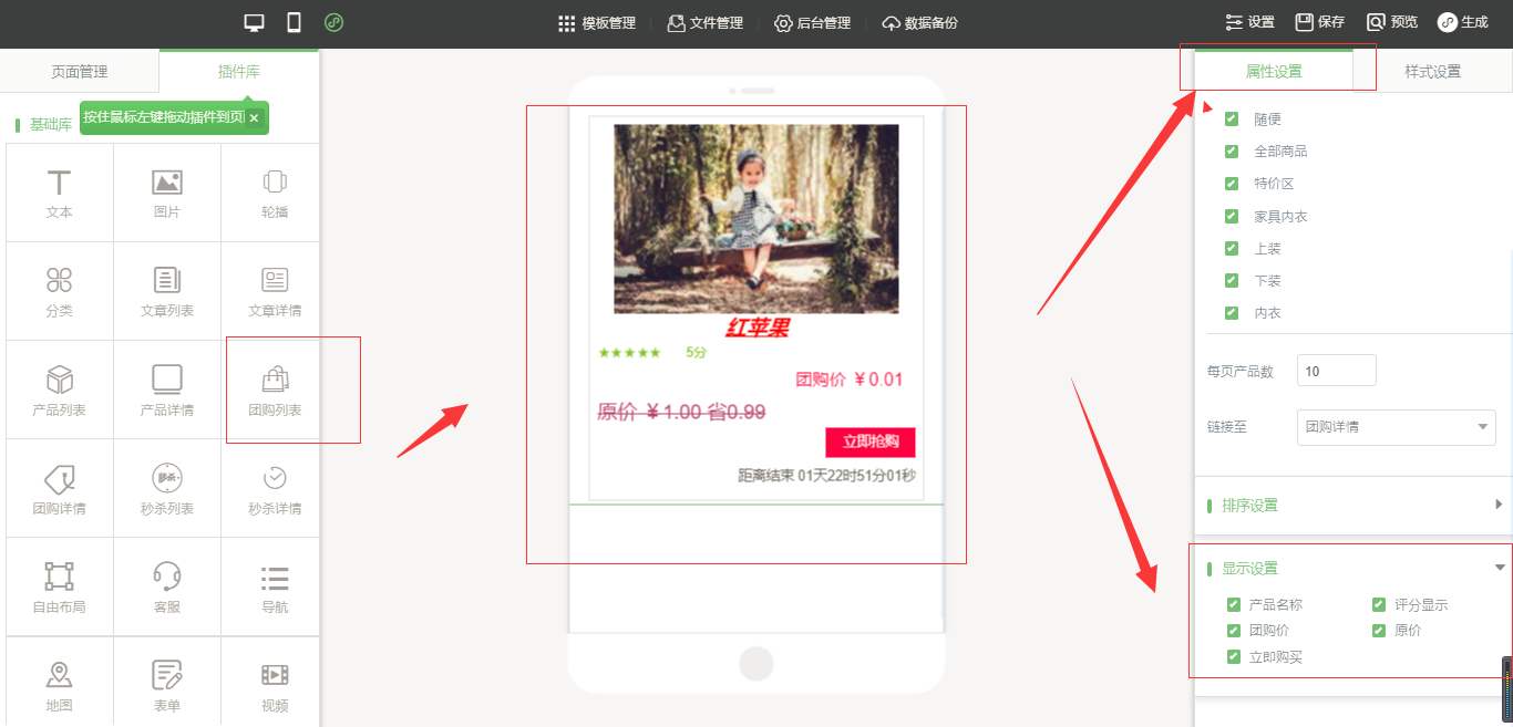 1.点击“后台管理”-“添加产品”-选择“团购”,然后添加产品信息,添加完成之后,点击“保存”,在小程序编辑器中拖入“团购列表”插件。点击选中该插件,在页面的右侧,有“属性设置”和“样式设置”,“属性设置”包括“排序设置”、“显示设置”等、“样式设置”包括“背景设置”、“边框设置”、“文字设置”、“图片设置”、“分割线设置”、“间距设置”,设置完毕后,点击保存,然后新建一个“团购详情”页面,拖入“团购详情”插件,在团购详情中同样也有“属性设置”和“样式设置”,设置完成点击保存,然后返回到“团购列表”中将“链接至”选中团购详情页面,然后点击保存即可,如图所示: