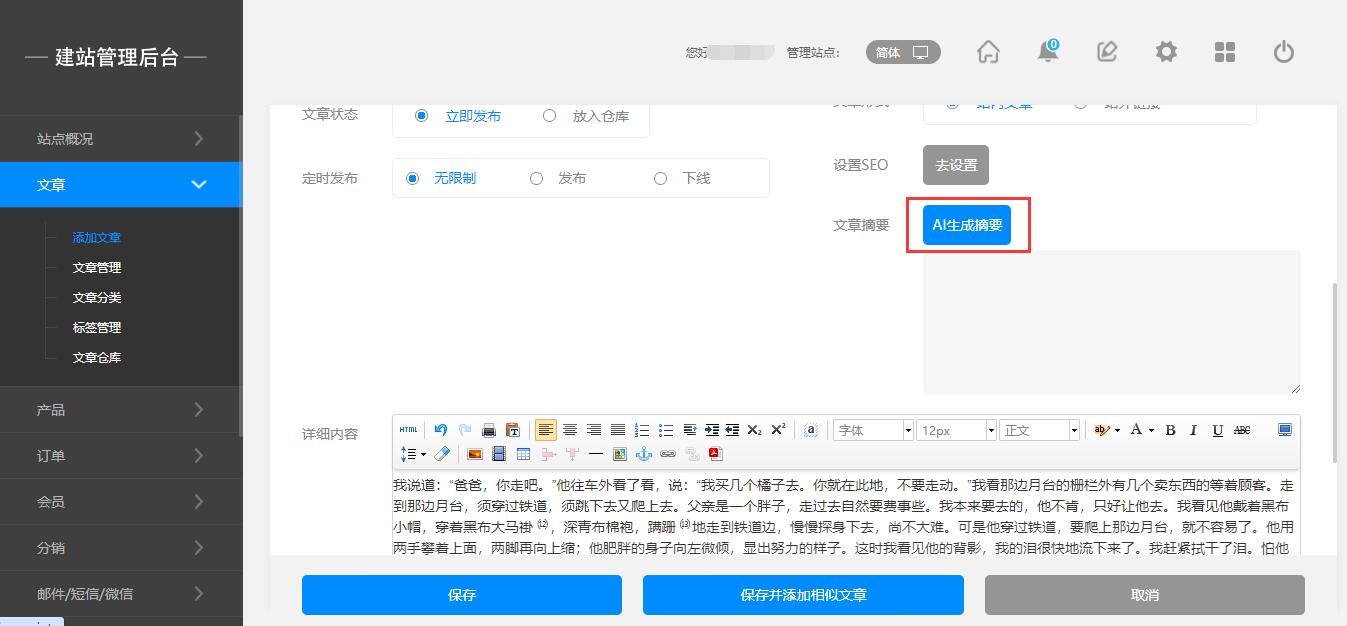 提示:必须要先填写文章详情内容,才能使用AI提取摘要功能,AI使用次数是根据免费的额度来定,超过需要单独购买